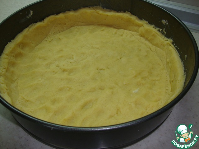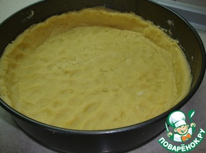 На дно разъёмной формы ( диаметр = 26 см) положить бумагу для выпечки, стенки смазать сливочным маслом. Распределить в форме тесто.