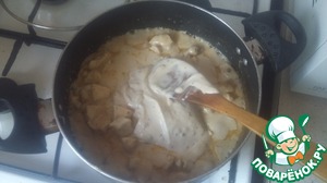 Вливаем в курицу сливки или сметану (на Ваш выбор) и выкладываем туда весь сыр и добавляем воды.