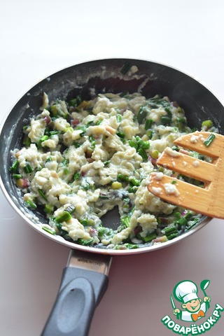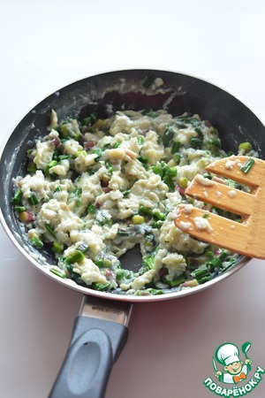 Влейте яйца к черемше и готовьте, помешивая, пока они не превратятся в хлопья