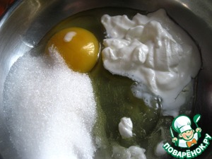 Смешать яйцо, сметану, сахар и соль. Влить молоко, перемешать.