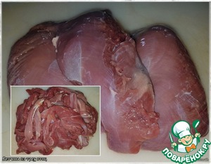 Режем ее полосками. По длине всей грудки. Т. е. вдоль.