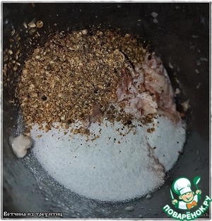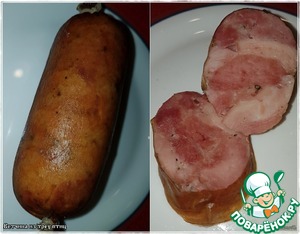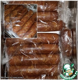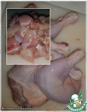 Не в смысле трех скворцов поймал и съел, а взял мяса понемногу от трех видов птиц... съедобных Опыт приготовления ветчины из птичьего мяса, а это была и индюшка, курица, например, показал, что получается вкусно, но как ни крути, а суховато. А рулет из утки и даже с яблоками, сочен, но немного жирноват. А тут встретился весьма оригинальный рецепт рулета, но по сути – это ветчина, из мяса сразу трех птиц. Идея понравилась, спасибо автору рассказа. Вот и решили мы его осуществить. На фотографиях ветчина еще в горячем виде. Не утерпели. Но даже и так…, в общем, главная цель была достигнута. Получилось очень сочно!!! Это пока ветчина была горячая, а потом…, впрочем, про «потом» и будет сказано тоже потом.