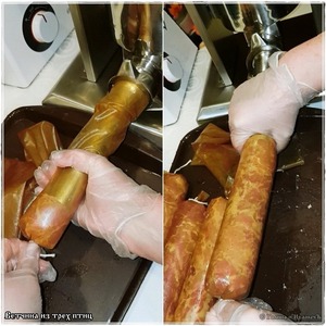 Формируем ветчинные колбаски. Можно просто взять, и слепить – закатать в пленку для запекания, можно в коллагеновую пленку. Но! Оптимальный диаметр – не более шести сантиметров. А длинна…, рассчитывайте так, чтобы порции получились граммов по триста – четыреста.