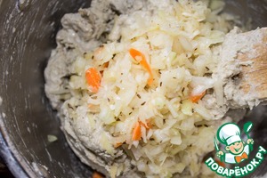 В мучную смесь вливаем масло, оставшуюся теплую воду, разведенные дрожжи и тщательно перемешиваем. Добавляем капусту с луком и замешиваем тесто.