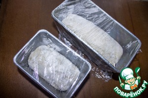 Наше тесто подошло хорошо, увеличилось в два раза. Достаем его, формуем и выкладываем в смазанную маслом форму. Форму накрываем пищевой пленкой и убираем в тепло еще на 30 минут.