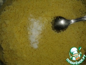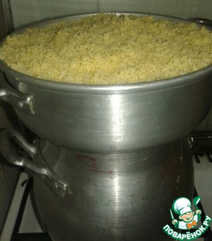 По истечении 20 мин кус кус вываливаем в ту же посуду где мы его перетирали, после того как кус кус немного остынет добавляем растительное масло примерно 1 ст. л, соль по вкусу и воды чуть больше пол стакана и снова перетираеи руками, чтобы не образовалось комочков и возвращаем его снова в посуду и варим еще 20 мин.