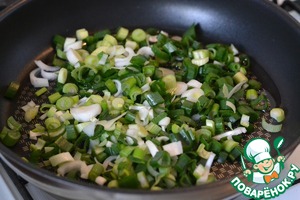 Зеленый лук нарезать и слегка обжарить на подсолнечном масле.