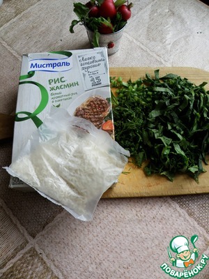 Рис жасмин очень нежный, поэтому я его варю не 15 минут, а 12 –в самый раз. И- да- нам 2 пакетика хватает на три порции. Ставим кипятить воду под рис и хорошо промываем зелень. У меня лук, укроп, шпинат и ботва редиски. Зелени чем больше, тем вкуснее. Просушенную зелень мелко шинкуем.