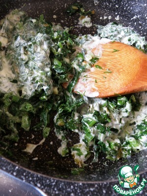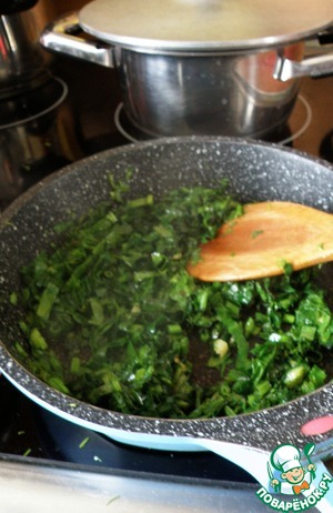 Рис опускаем в воду, соли чуть-чуть. На сковороде разогреваем растительное масло и чуть припускаем лук. Выкладываем остальную зелень и, помешивая, даем ей осесть.