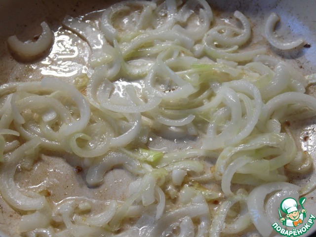 Лук нарезать полукольцами, обжарить на растительном масле до золотистого цвета, 2-3 минуты.