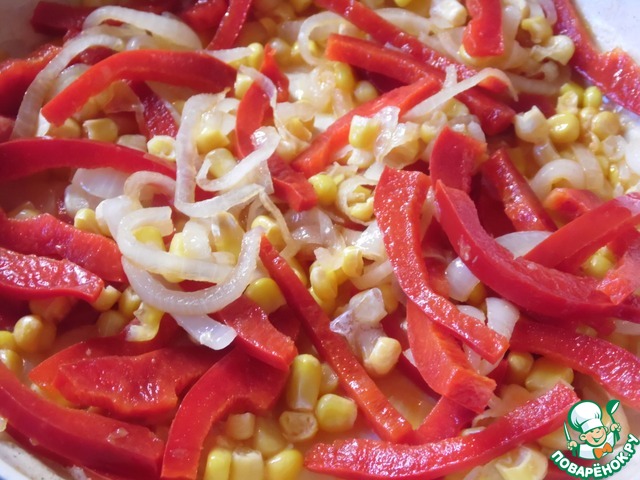 Перец нарезать полосками, вместе с кукурузой и соевым соусом добавить к луку, обжарить 5-6 минут, помешивая.