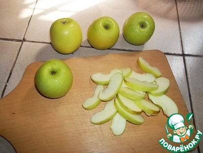 Яблоки разрезать пополам, удалить сердцевину и, не снимая кожуру, нарезать тонкими ломтиками. Сложить в миску.
