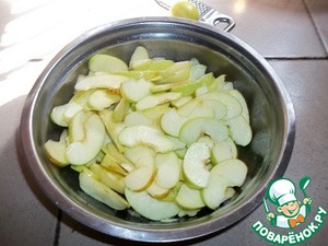 Залить яблоки 1ст. л. лимонного сока и 1/2 ст. л. растопленного масла. Я встряхиваю миску, чтобы яблочные дольки равномерно покрылись соком и маслом.