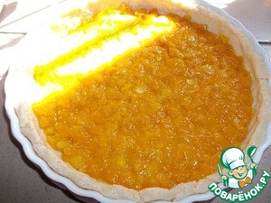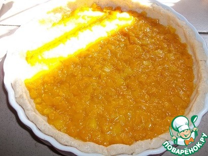 Тесто достать из холодильника, выложить в форму (диаметр моей 26см), хорошо смазанную раст. маслом, утрамбовать ладонью, соорудив бортики. Распределить манговую начинку.