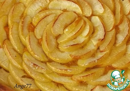 Выложить внахлёст по спирали дольки яблок, слегка вдавливая их в манговую начинку. Посыпать сахаром (немного).