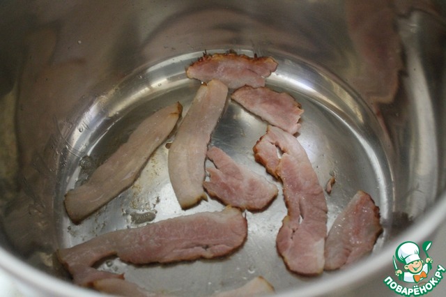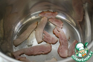 • Начнем с "секретного" ингредиента. Это бекон. Конечно, не самая полезная для фигуры и здоровья вещь, но его нужно всего 50 граммов, этого достаточно, чтобы придать супу нужный вкусовой оттенок, и не навредить нам с Вами. Итак, полоски бекона немного обжариваем в сухом сотейнике.