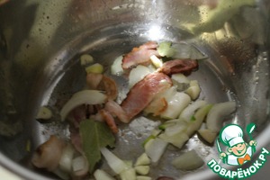 • Добавляем к бекону произвольно нарубленный лук, чеснок и лавровый лист, обжариваем еще около минуты, помешивая. Солим.
