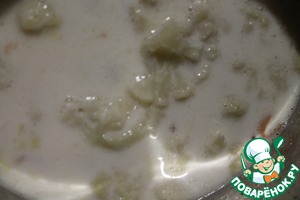 • Вливаем сливки, бульон и кладем цветную капусту. Варим до готовности капусты (20-25 минут). Удаляем лавровый лист. Суп измельчаем блендером. Если необходимо, досаливаем.