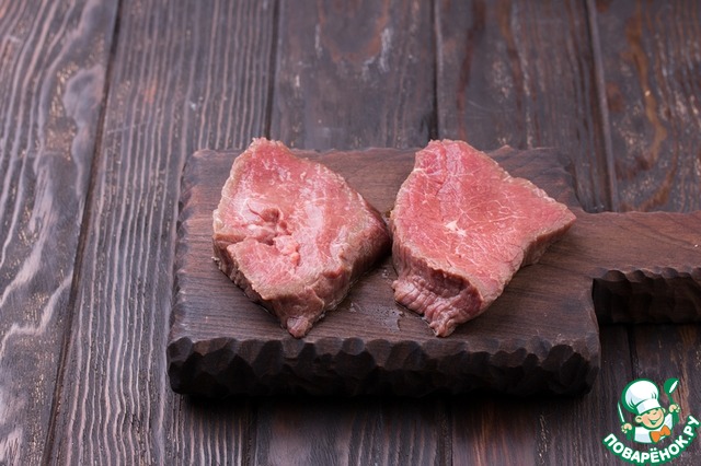 Нарезать говядину на стейки поперек волокон толщиной 2-2,5 см.