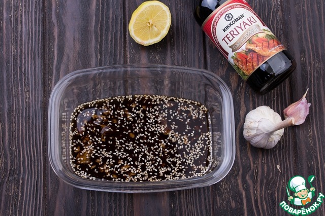 • Смешать ингредиенты для маринада. Добавить соевый соус (у меня Терияки) и кунжутное масло. Если используете не Терияки, а простой соевый соус, то увеличьте количество чеснока еще на 1 зубчик и количество сахара на 0,5 ст. л.
