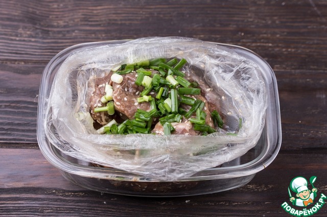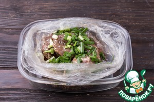• Замариновать мясо в маринаде. Добавить нарезанный зеленый лук, плотно упаковать в полиэтиленовый мешок и оставить минимум на 3 часа в холодильнике. За это время несколько раз перевернуть мешок.