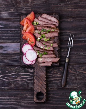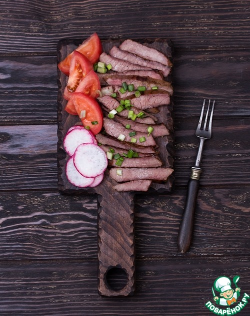 • Снять стейки с огня и дать отдохнуть минут 5-7. Затем тонко нарезать, посыпать зеленым луком и крупной морской солью. Подавать со свежими овощами.