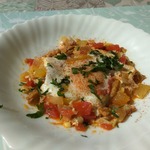 Затем добавить помидоры и тушить всё в сковороде на маленьком огне до полного размягчения помидоров. Посолить, добавить зиру, паприку и куркуму. Именно они создают тот восточный вкус и запах.