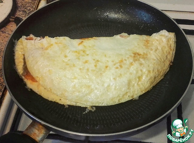 Свернуть омлет накрыв его половиной без начинки, кстати, чем тоньше наш "блинчик", тем легче будет его свернуть. Подержать под крышкой на маленьком огне где-то пол минуты, затем выключить огонь и дать постоять минут 5.