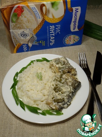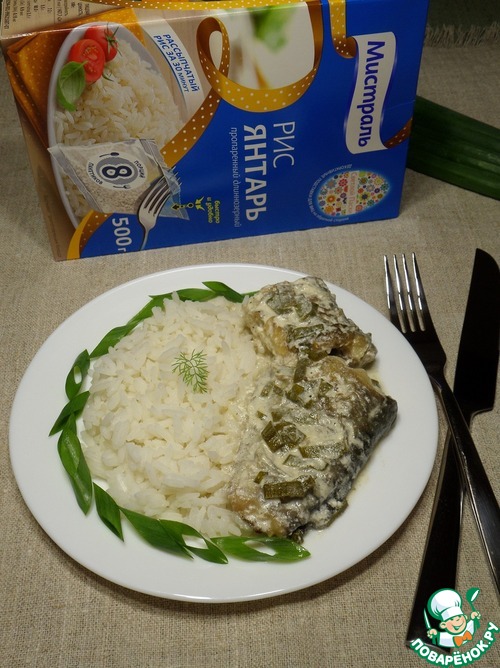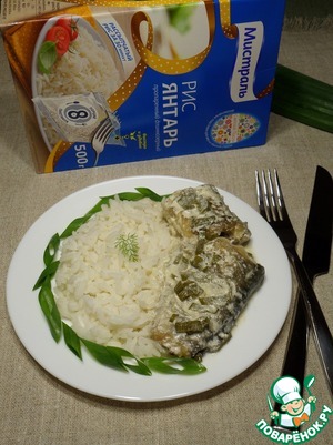 • Выкладываем рис. Добавляем рыбу и сметанный соус. Подаем, добавив зелень.