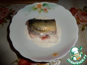 • В чашку выкладываем 1ст. л. муки и 0,5 ч. л. соли. Перемешиваем. Панируем куски рыбы.