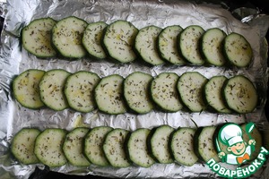 Цуккини режем не очень тонкими кружочками и выкладываем в ряды внахлест в форму, застеленную фольгой. Солим, посыпаем травами, поливаем оливковым маслом. Ставим в духовку, разогретую до температуры 190-200 градусов, на 25 минут. Если хотите, чтобы цуккини получились "аль денте", то есть слегка похрустывали, сократите время приготовления на 5-8 минут. В конце можно посыпать цуккини сыром, тогда Ваш ужин будет еще более изысканным.