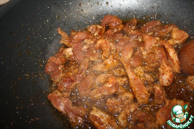 Раскалить масло и обжарить мясо небольшими порциями. У меня получилось четыре порции. Обжаривать каждую порцию мяса около 4- 5 минут.