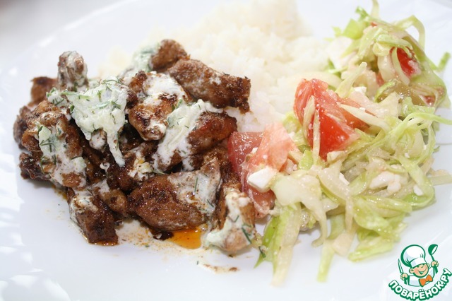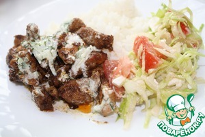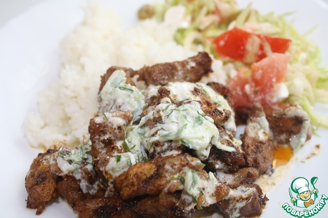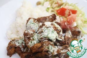 Желательно полить мясо соусом цацики, он очень хорошо подходит к этому блюду.