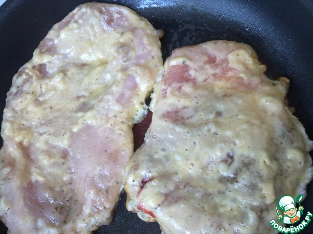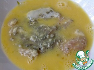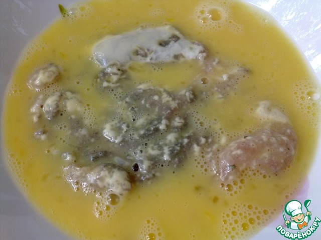 Яйцо вбиваем в миску и хорошо взбиваем вилкой. Отбивную обмакнуть в яичную смесь с двух сторон.
