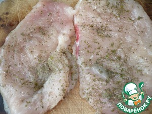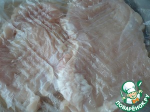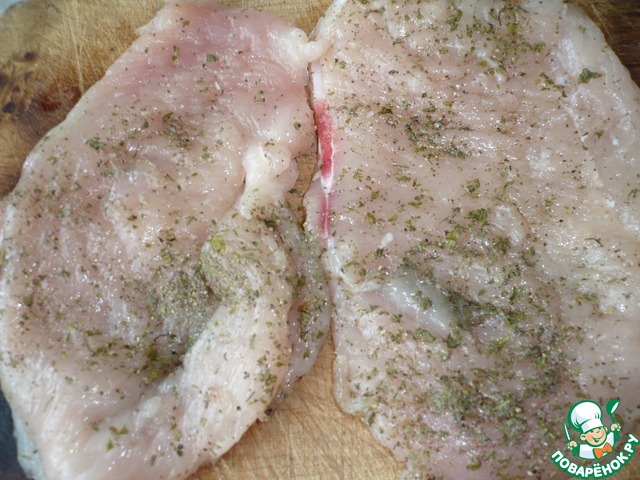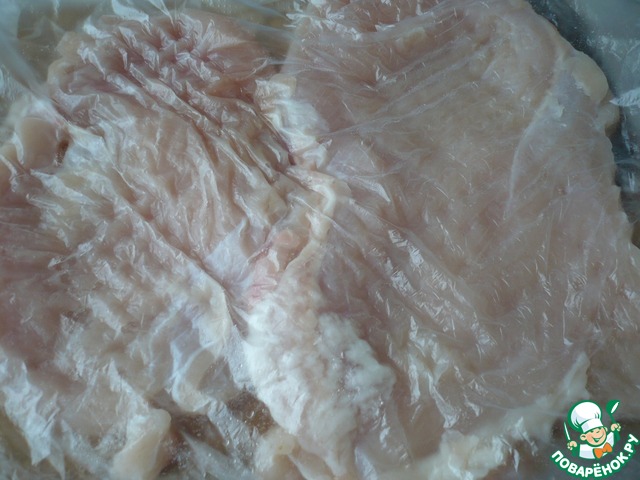 Разрезать вдоль на части и слегка отбить (положив в целлофановый кулек).