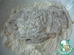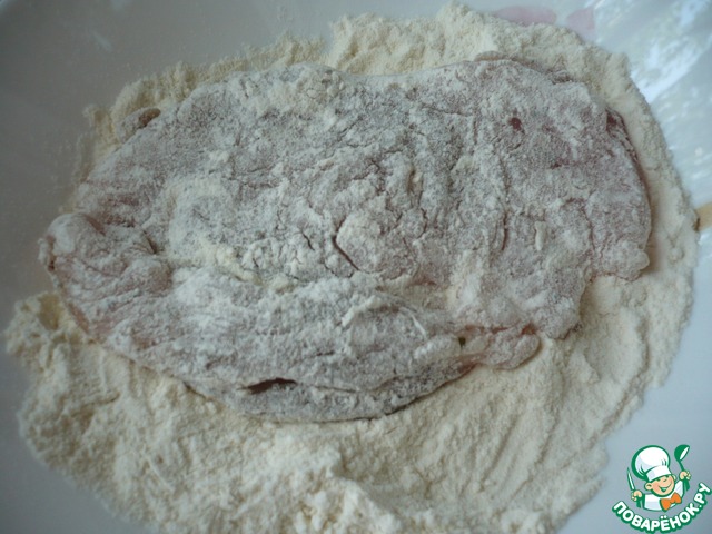 В глубокую тарелку насыпаем муку и обваливаем в ней куриные отбивные.