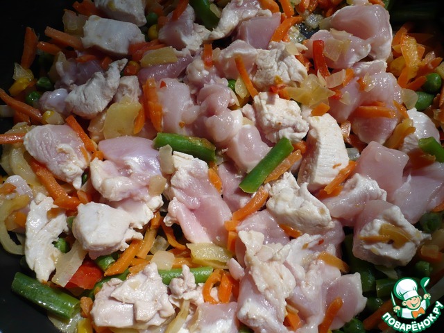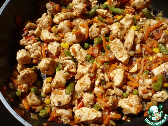 Добавить в обжаренный лук замороженную овощную смесь (я взяла мексиканскую - фасоль стручковая, морковь, зеленый горошек, кукуруза, перец болгарский) и потушить 5 минут.