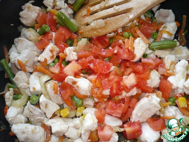 Помидор добавить к овощной смеси и курице. Продолжить тушить, накрыть крышкой.