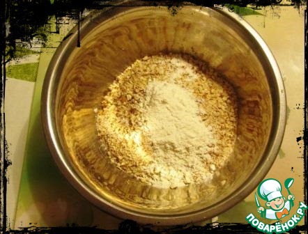 Миндаль с 1 столовой ложкой сахара измельчаем в мелкую крошку. Смешиваем в миске миндальную крошку, муку и разрыхлитель