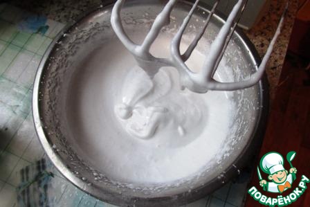 Яйца разделяем на белки и желтки. Взбиваем белки с 1 столовой ложкой сахара до мягких пиков.