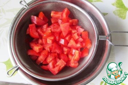 Плотные мясистые помидоры нарезаем кубиками, складываем в сито, посыпаем солью и оставляем на 10 минут