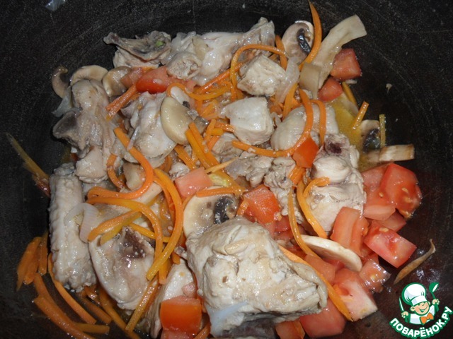 В обжаренную курицу добавляем поочередно подготовленные ингредиенты, после каждой закладки - перемешиваем. Сначала - лук, затем морковь, следом - шампиньоны и после них - помидоры.