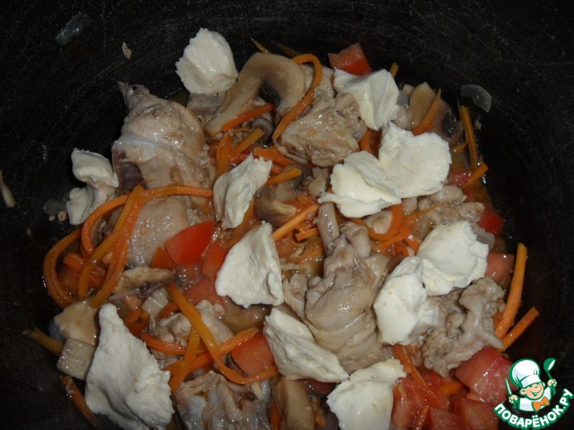 Даем закипеть, а после добавляем плавленый сырок, разделенный на кусочки и снова перемешиваем. 3акрываем крышкой и тушим до готовности. В конце приготовления приправляем солью и черным молотым перцем, перемешиваем.