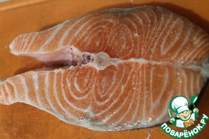 Стейк семги чистим от чешуи, посыпаем солью и сахаром, даем постоять.