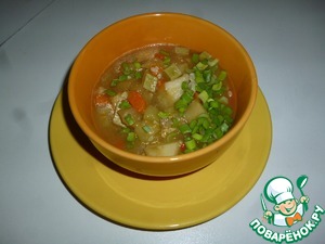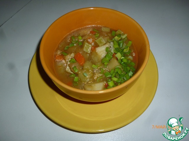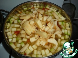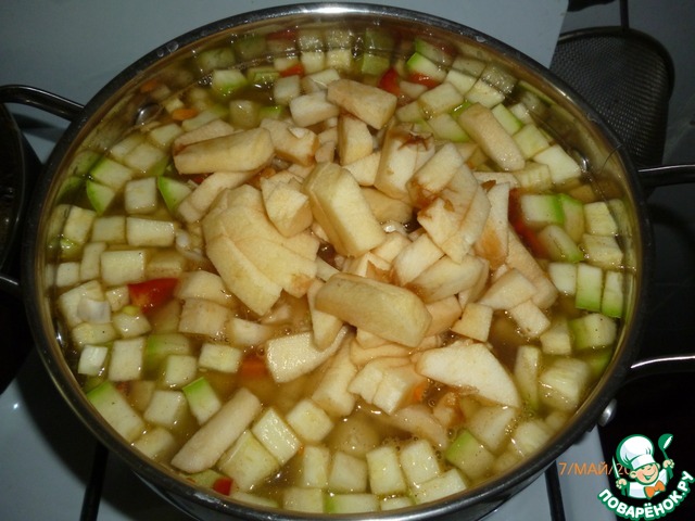 До кипения можно не доводить, минуток через 10 добавляем остальное: лучок и яблочки. Ну и все варим минут 30-40, что бы жидким сильно не получилось минут 40. Минут за 5-10 добавьте 3 столовых ложки масла подсолнечного и ложку соевого соуса на свое усмотрение.