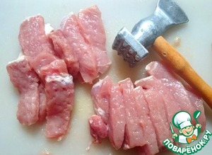 Мясо нарезаем дольками, отбиваем до толщины полсантиметра.