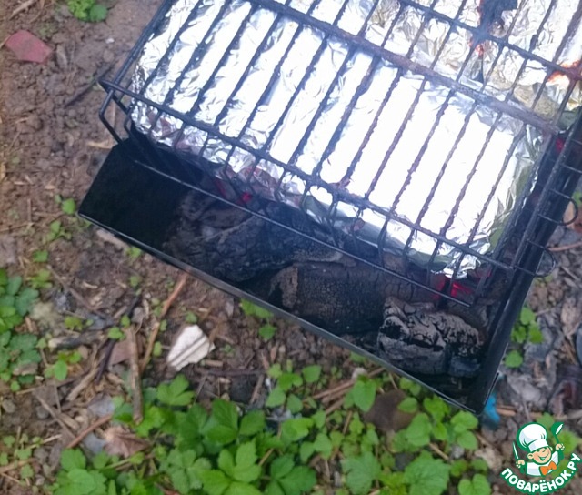 Затем обсыпаем сухарями с чесноком и укладываем кусочки мяса "стоя" в один ряд вплотную друг к другу на фольгу, плотно сворачиваем.