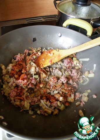 Выложили фарш, посыпали паприкой и, помешивая, обжариваем, разбивая комочки, до рассыпчатости фарша. Добавляем сладкий перец и прогреваем его.