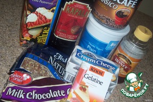 В остальных 400 мл. развести кофе с ликёром + 2 ст. л. сахара (если делаете с желе, то сначала развести кофе, потом замочить пачку желе в кофе, добавить 2 ст. л. сахара, мешать до растворения сахара).