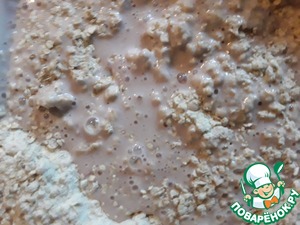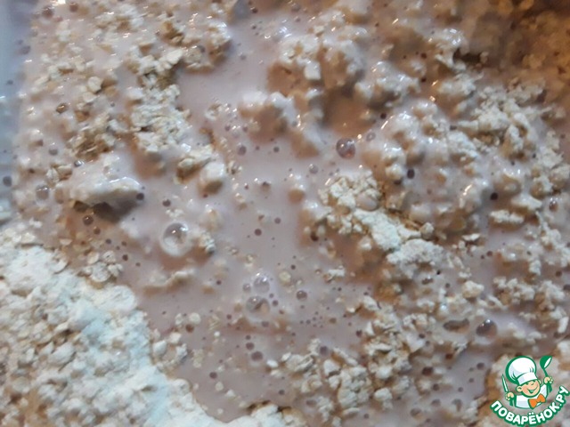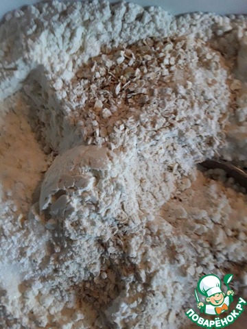 В сухую смесь выливаем йогурт смешанный с молоком и тщательно всё перемешиваем, тесто должно получиться плотное, немного липнущее к рукам, если вдруг получилось сильно жидкое тесто, то можно добавить немного хлопьев или муки.